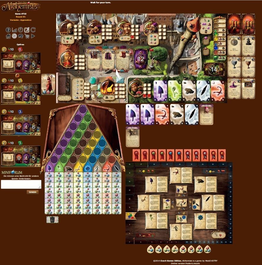 Anfangen möchte ich mit DIE ALCHEMISTEN von Matúš Kotry – erschienen bei CGE (bzw. Heidelberger Spieleverlag). Dieses 2014 in Essen vorgestellte Spiel ist nun online bei Boîte à Jeux spielbar – und zwar ganz ohne App.