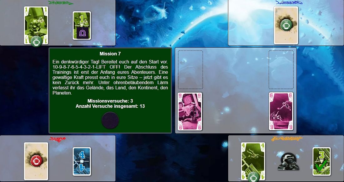 Allerdings kann ich nur davon abraten, dieses Spiel rundenbasiert zu spielen. Nicht alle Spiele sind für diese besondere Form des digitalen Spielens geeignet – und meiner Meinung nach trifft das auch hier auch DIE CREW zu. Deswegen nutzt am besten die technischen Voraussetzungen der Board Game Arena und spielt das Spiel live – gerne auch mit einem aktiven Chat. Allerdings sollte man sich natürlich an die Kommunikationsregeln halten. Aber nur stumm irgendwelche Karten ausspielen – das wird dem besonderen Reiz des Spiels nicht gerecht. Denn danach muss doch gefachsimpelt werden, warum wer welche Tipps ausgespielt hat. Nur so schafft man sich ein gemeinsames Wissen an. um schlussendlich erfolgreich zu sein.