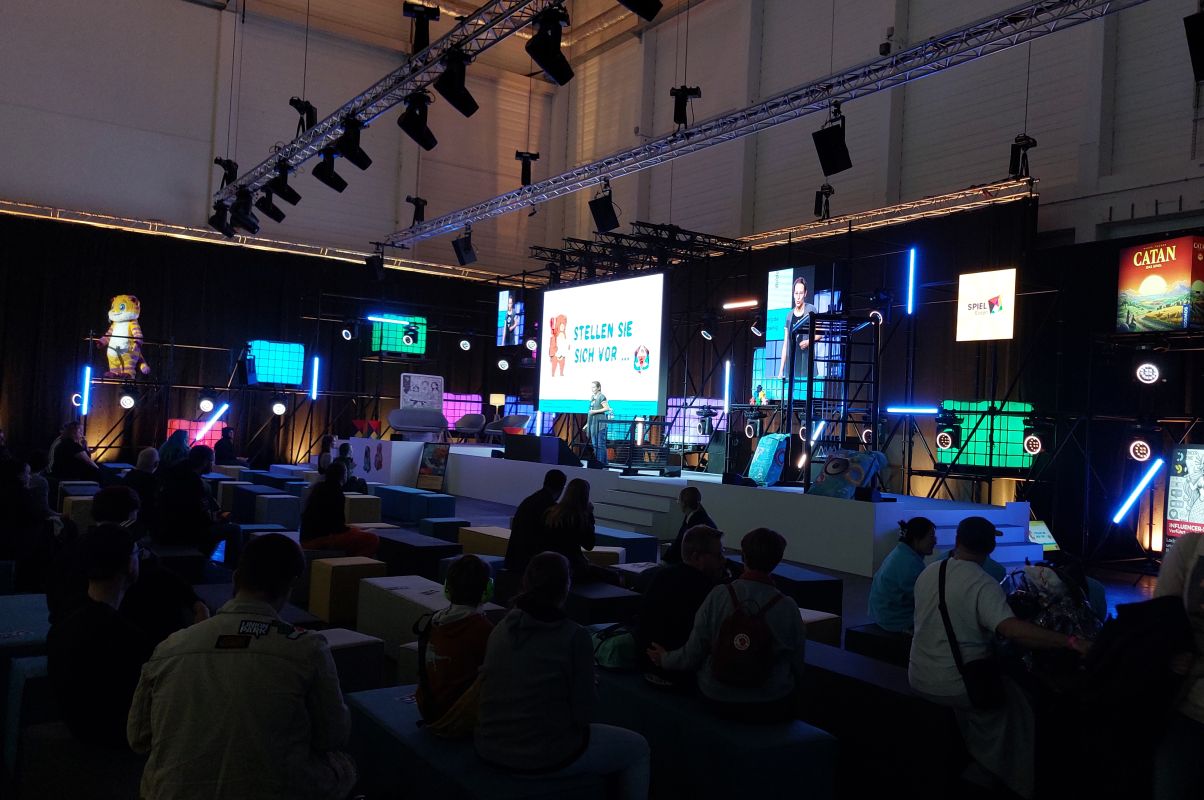 Eines vor­weg: der Merz-Ver­lag als Aus­rich­ter der SPIEL in Essen ist ein Wirt­schafts­un­ter­neh­men. Die Mit­ar­bei­ten­den wol­len über das Jahr fair bezahlt sein und es ver­langt nie­mand, dass die Mes­se zum All­ge­mein­wohl kos­ten­frei ange­bo­ten wer­den soll. Seit dem Ver­kauf des Merz Ver­la­ges an die Spiel­wa­ren­mes­se eG ist vie­les pro­fes­sio­nel­ler gewor­den. Zum Groß­teil wird das auch geschätzt. Ein Bei­spiel dafür war die neue Büh­ne in Hal­le 4. Ich weiß nicht, wie die Ver­la­ge im direk­ten Umfeld auf die­se reagiert haben. Aber ich fand deren Beschal­lung auch nicht lau­ter als die HITS­TER-Demorun­den. Somit wur­de jeden­falls das nicht zu ver­ach­ten­de Rah­men­pro­gramm etwas pro­mi­nen­ter prä­sen­tiert. Ich bin gespannt, wie die­se Büh­ne in Zukunft bespielt wer­den wird und wie die Reso­nanz dar­auf ist.