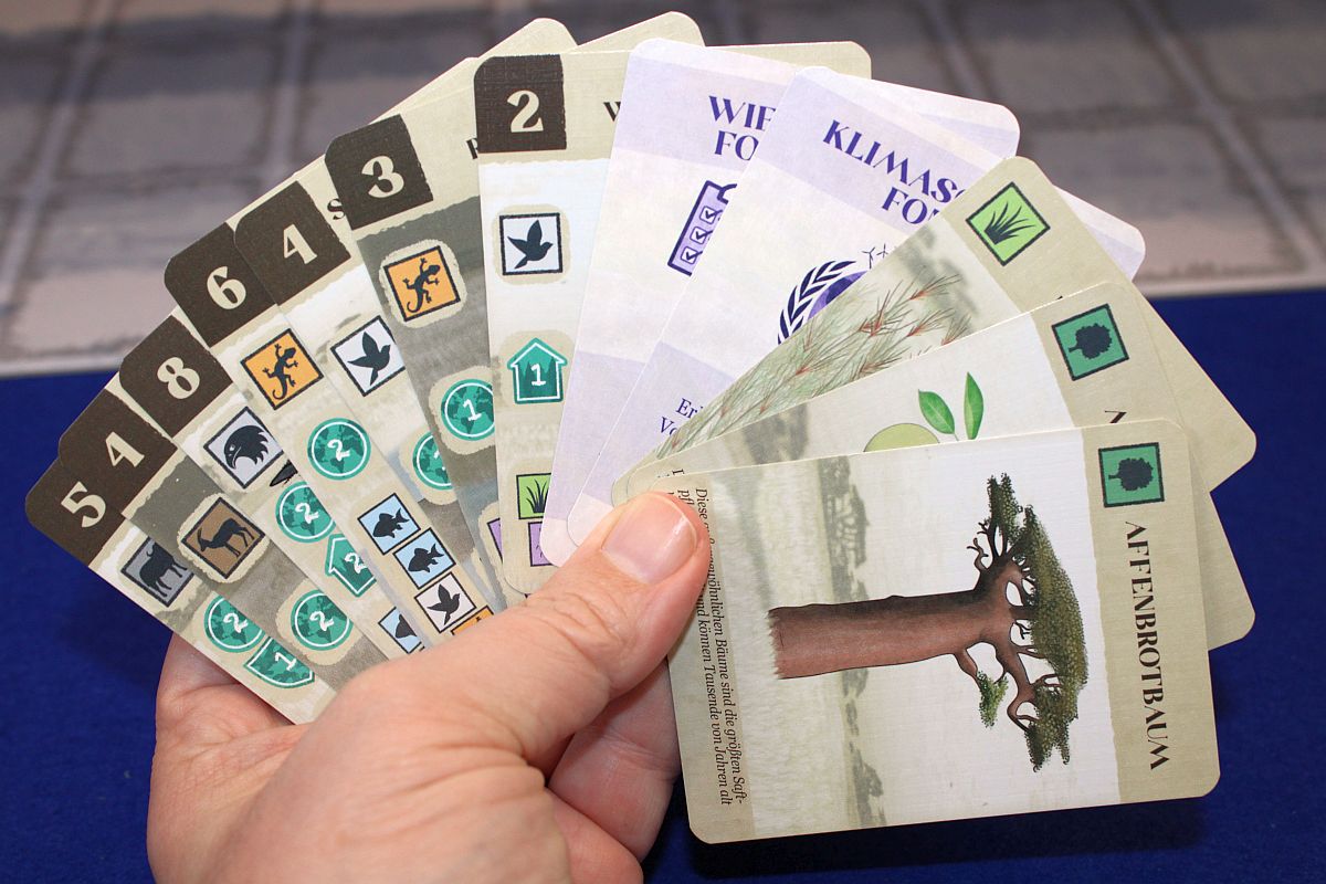 Zum Nachdenken anderer Art regt das Material an. Benötige ich wirklich diese überdimensionierten persönlichen Ablagen? Selbst wenn ich dies möglicherweise bejahen sollte, habe ich manchmal schlicht gar nicht ausreichend Platz dafür. Ich lasse das Argument gelten, dass die darüber gegebene Struktur helfen kann. Doch überdimensioniert sind sie trotzdem. Und auch die zu spielenden Karten habe ich anderen Spielen schon kleiner erlebt, was dann vielleicht auch zu einer besseren Handhabung führt. Denn das Foto mit der aufgefächerten Starthand ist irreführend. Im Normalfall halte ich die Karten als Päckchen in der Hand und sortiere sie dort hin und her. Zumal bei der Methode des Auffächerns ohnehin manche wichtige Informationen gar nicht erkennbar sind.