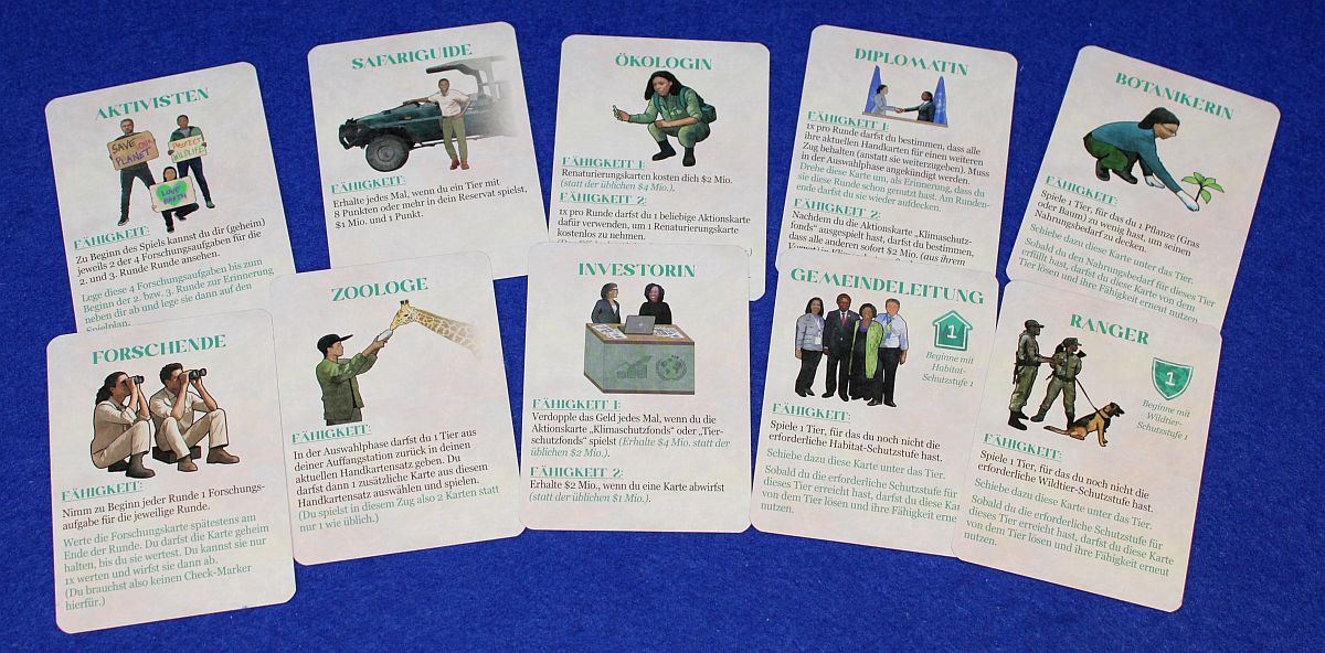 Am Ende unseres Spielzuges können wir offen ausliegende Forschungskarten erfüllen, womit wir nicht nur mit Siegpunkten, sondern auch mit Geldmarkern belohnt werden. Diese benötigen wir, um unterschiedliche Schutzstufen auszulösen, die wiederum Ausspielbedingung für manche Tiere sind.