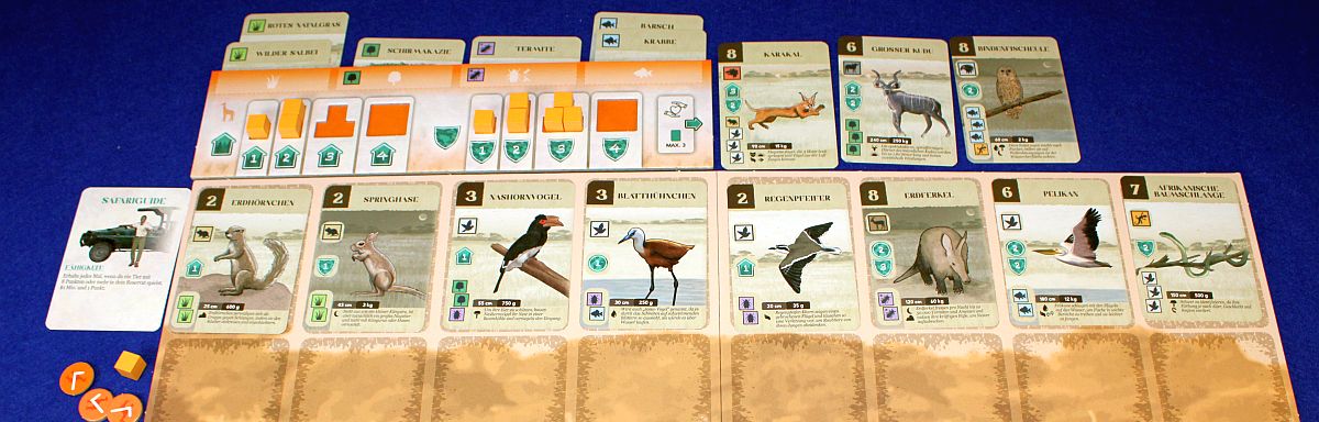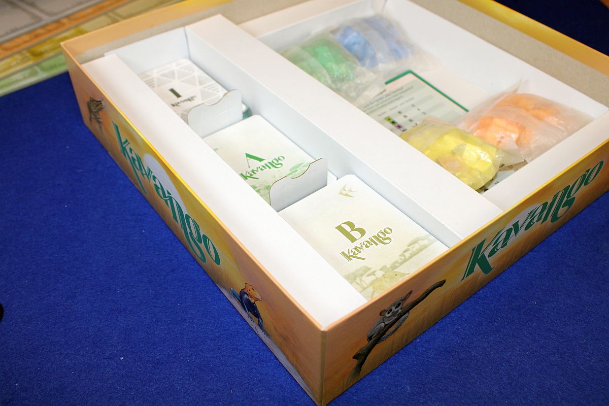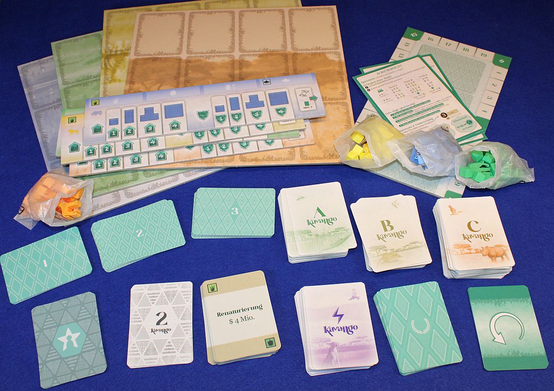 Ausstattung: KAVANGO ist im Kern ein Kartenspiel. Entsprechend umfangreich ist die Auswahl: Wildniskarten, Aktionskarten, Forschungskarten, Zielkarten, Renaturierungskarten usw. All diese müssen zu Beginn umfangreich sortiert und jeweils gründlich gemischt werden. Der zentrale Spielplan dient hauptsächlich als verwaltende Ablage. Eine ähnliche Funktion haben auch die überdimensionierten persönlichen Tableaus.