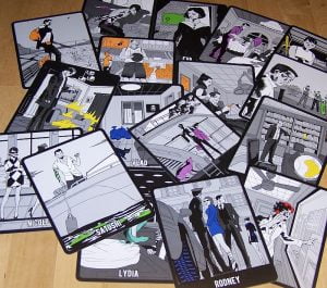 Aus­stat­tung... besteht aus 50 groß­for­ma­ti­gen Kar­ten, die alle min­des­tens eine Per­son und ihr Umfeld zei­gen. Geord­net sind die Fäl­le dann nach den Vor­na­men der Ver­däch­tig­ten. Die Rück­sei­te der Kar­ten darf nur vom Spiel­lei­ter ange­se­hen wer­den, da sich hier­auf die Auf­lö­sun­gen und Hin­wei­se befinden.