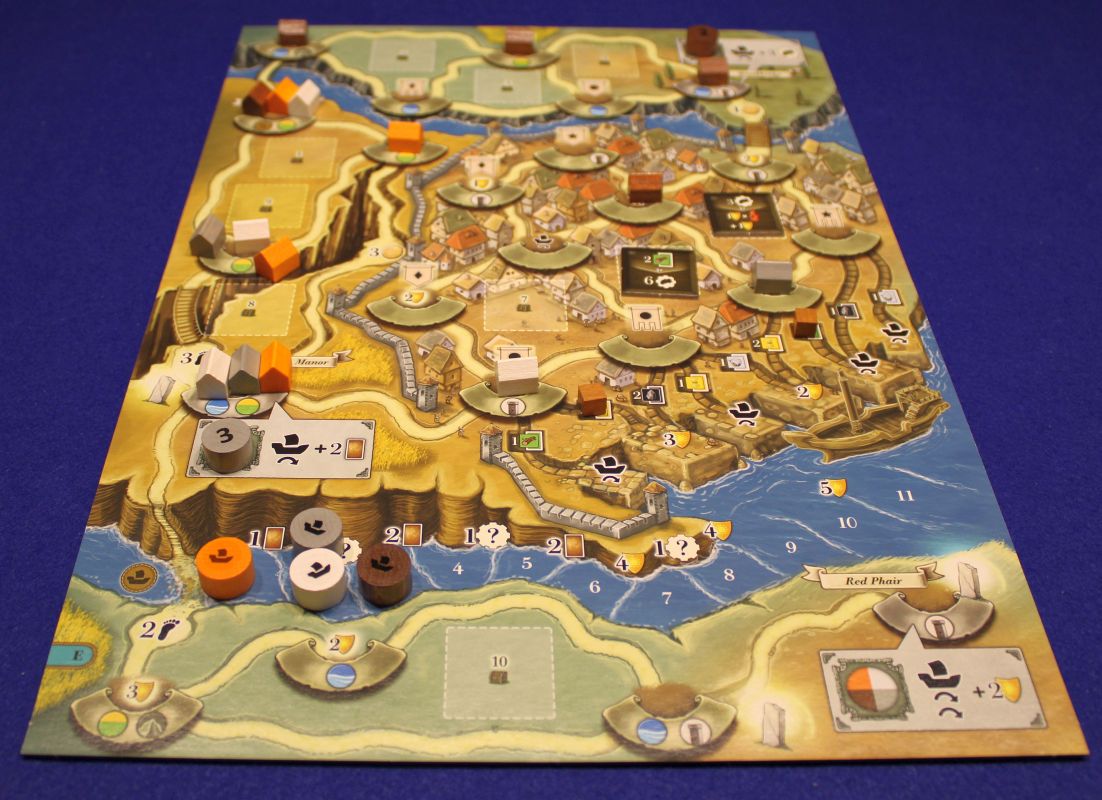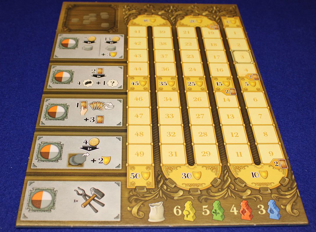 Die einzelnen Produktionsgebäude geben nun keine Rohstoffe mehr vor, sondern sie zeigen auf, welche farbigen Gehilfen man zum Produzieren benötigt. Zusätzlich gibt es nun in Worker-Placement-Manier auch alternative Aktionsmöglichkeiten. Dafür (und auch zum Produzieren) stehen anfangs zwei Aktionsscheiben zur Verfügung, die man gegen Aufpreis auch auf bis zu vier vermehren kann. Über diese Aktionsfelder kann man sicher Kohle produzieren, neue Karten erhalten oder zusätzlich weitere Gebäude bauen. Die werden nun aber nicht nur als Karten ausgelegt, sondern es werden ganz real kleine Häuser auf dem Spielplan verteilt – durchaus verbunden mit einem Baurabatt für bestimmte Voraussetzungen.