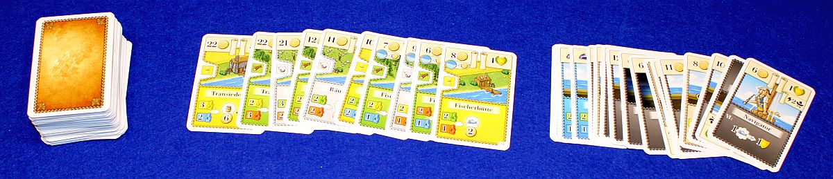 Ausstattung… auch wenn AUFBRUCH NACH NEWDALE berechtigterweise als Brettspiel zur OH MY GOODS! Reihe bezeichnet wird, so bleiben doch die Karten dominant – schließlich sind davon 220 in der Box. Der Großteil davon sind Gebäudekarten im bekannten Stil, aber es gibt auch Personenkarten, Seemannskarten, Ereigniskarten, Kapitelkarten usw.