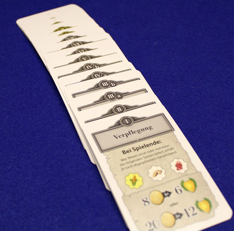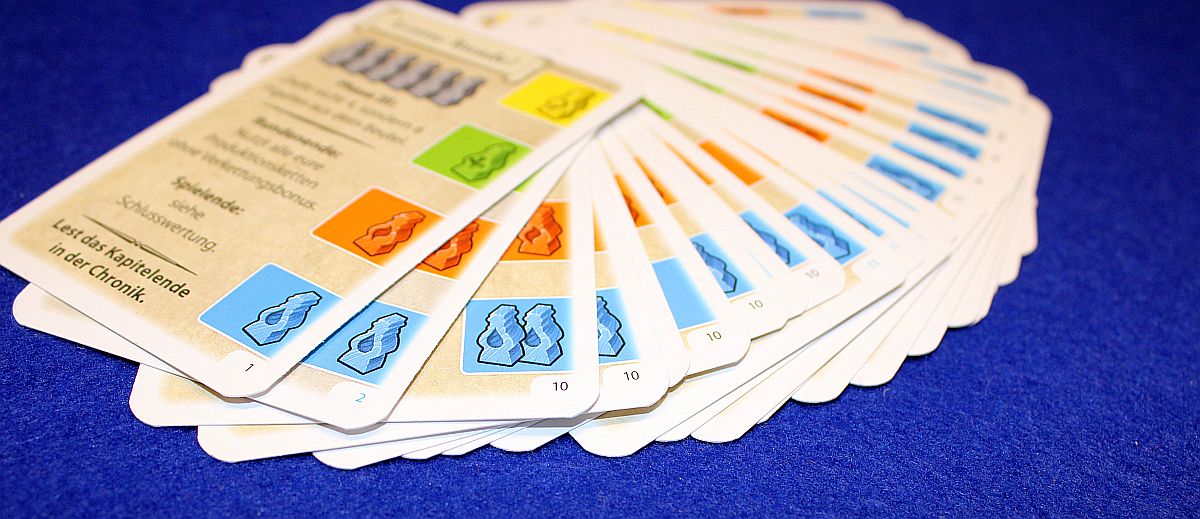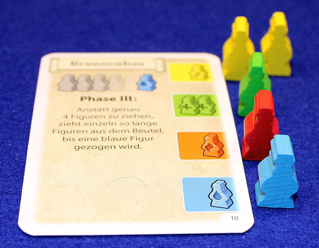 Ablauf… hat sich doch stärker verändert, als ich das erwartet habe. Eigentlich ging ich nämlich davon aus, dass der bisherige Kartenmechanismus zum Erzeugen der Waren beibehalten würde – dem ist aber nicht so. Statt nun also Karten in einer Sonnenaufgangs- und Sonnenuntergangsphase aufzudecken, werden nun in der Regel lediglich 4 hölzerne Figuren ("Gehilfen") aus einem Beutel gezogen. Trotzdem bleibt das ursprüngliche Zockerei-Gefühl erhalten, denn weiterhin muss man sich im Vorfeld festlegen, ob man seine Warenproduktion schlampig oder ambitioniert durchführen will. Dazu geben die einzelnen Ereigniskarten schon einen Pool an farbigen Gehilfen vor, dieser wird dann durch das Nachziehen aus dem Beutel erweitert.