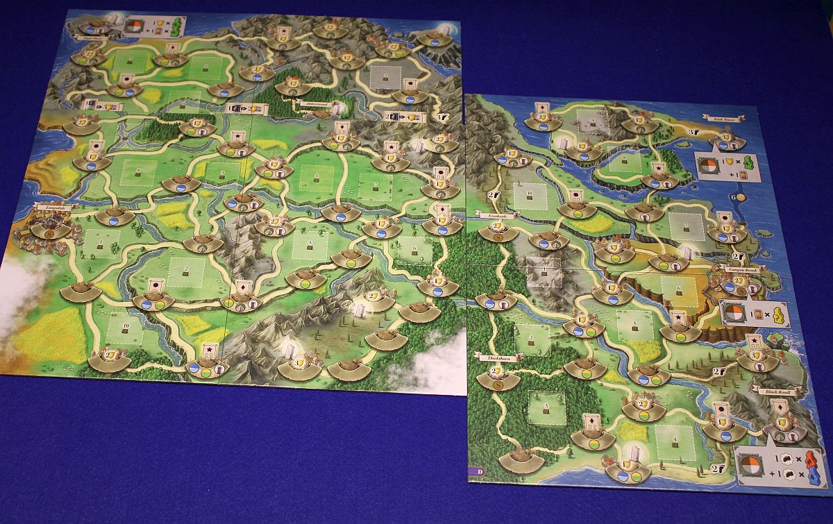 Sehr gelungen finde ich, wie das Push-Your-Luck-Gefühl des Kartenspiels auf das Brettspiel übertragen wird. Trotzdem entwickelt AUFBRUCH NACH NEWDALE aber auch seinen ganz eigenen Charakter. Der Spielplan ist mehr als nur ein optische Aufwertung. Durch die verschiedenen Elemente (Rabatte beim Gebäudebau, Belohnungen für schnelles Ausbreiten und dem Erfüllen der persönlichen Ziele) muss man sich schon genauer mit dem Spielplan und auch den Mitspielern auseinander setzen. In den ersten Kapiteln ist das noch recht beschaulich, aber je mehr man sich von Longsdale entfernt, umso interaktiver werden einzelne Spielelemente.