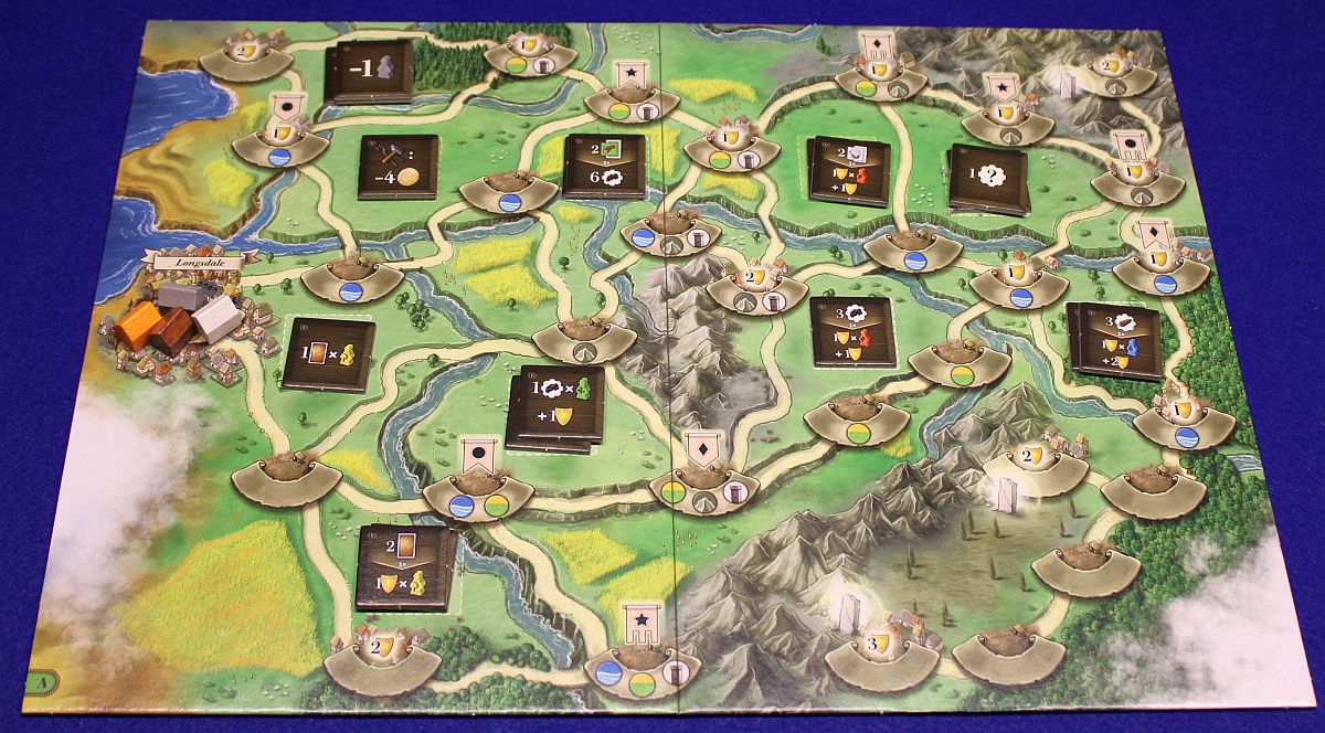 Illustrationen… sind von Klemens Franz und setzen logischerweise den bisherigen Stil fort. Viele Karten sind vertraut, aber natürlich entdeckt man immer wieder unbekannte Gesichter und auch Details. Ganz neu ist nun der Spielplan, schließlich waren die Spiele der OH MY GOODS! Reihe bisher immer reine Kartenspiele. So hat man endlich ein Bild vor Augen von Longsdale und Umgebung. Die gewählte Symbolsprache ist, wie man es von Klemens Franz gewohnt ist, eingängig und verständlich, so dass die grafische Gestaltung insgesamt wieder sehr rund geworden ist. Gut so!