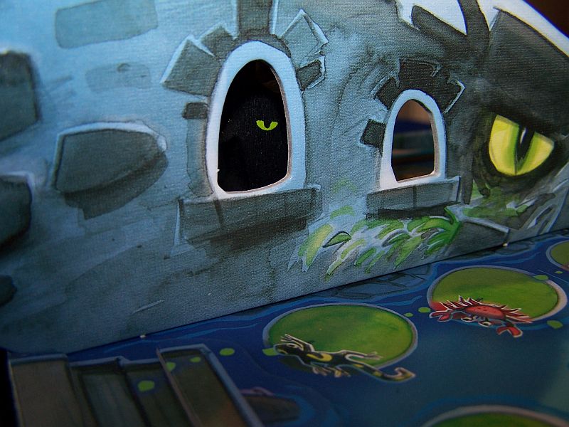Das gefällt mir nicht so gut: Der 3D-Aufbau ist mehr Fluch als Segen. Ja, die Stimmung wird damit erhöht, denn so ein gefährlich durchs Fenster schauender Rabenhorst macht schon Laune. Allerdings wird diese erheblich getrübt, wenn man dadurch wiederum große Teile des Spielplans nicht sieht. Aufgrund des Aufbaus sollten alle Mitspieler frontal zum See sitzen, da sie ansonsten mit Sichtbehinderungen rechnen müssen.