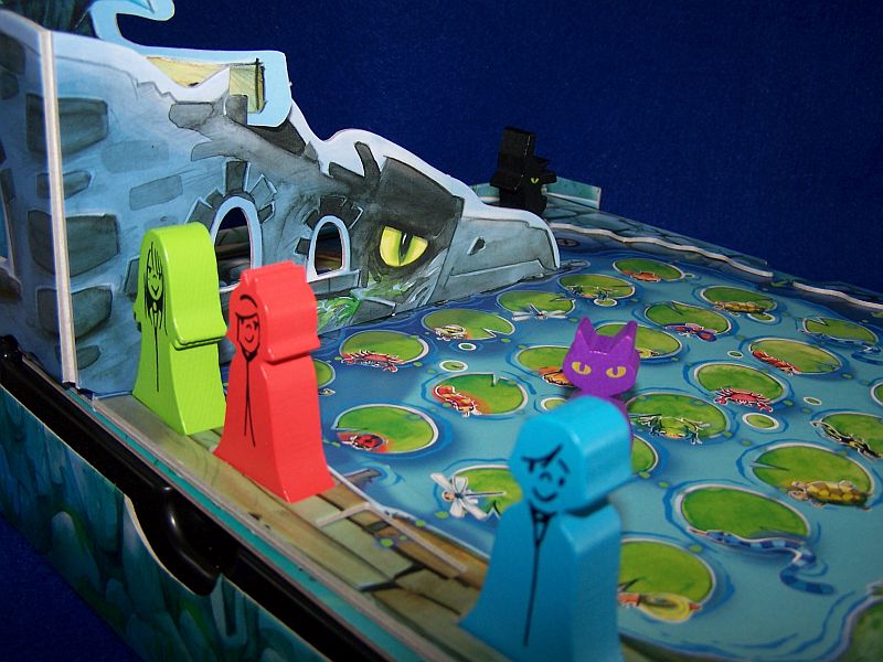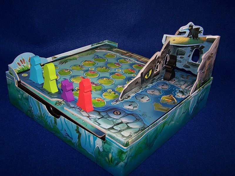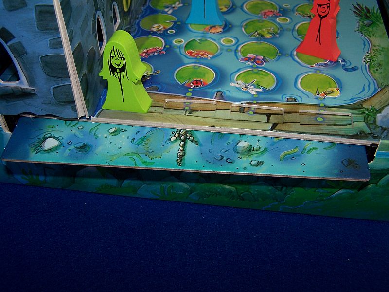 Ablauf... zu Beginn eines Spielzuges wird eines der runden Pappplättchen aufgedeckt. Zeigt dieses den Zauberer Rabenhorst, dann wird sofort der letzte Wasserstreifen (am Startpunkt der Kinder) rausgezogen und neu am anderen Ende wieder hineingeschoben. Damit verändern sich dann die Magnete unter den Seerosenblätter und teilweise können auch Figuren verschoben werden. Hat man dahingegen ein Tier aufgedeckt, darf man nun eine beliebige Spielfigur (mit Ausnahme des Zauberers) bewegen. Diese ziehen dann von Seerose zu Seerose und versuchen dabei, den Steg am anderen Ende des Sees zu erreichen. Erfahrungsgemäß klappt das nicht auf Anhieb, sondern man trifft zwischendurch auf ein Seerosenblatt, das verzaubert (=magnetisch) ist. Dann muss der Zug beendet werden und der nächste Spieler ist an der Reihe.