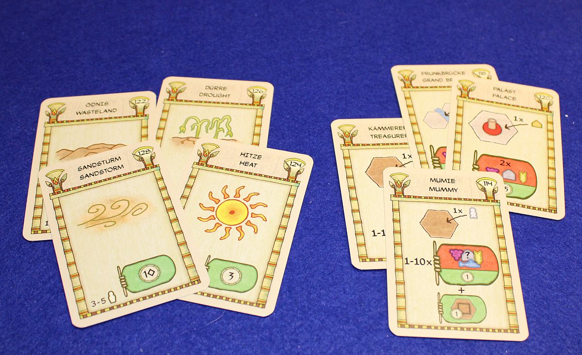 Die grafische Gestaltung empfinden manche als altbacken. Allerdings fördert dieser reduzierte Stil die Konzentration auf das Wesentliche, zumal der auch der ägyptische Bezug gewahrt bleibt. Die Symbolsprache ist anfangs vielleicht etwas verwirrend, aber dennoch logisch und nachvollziehbar. Besonders angetan bin ich von der liebevollen Ausstattung. Auch wenn der goldene Palast maximal nur zweimal gebaut werden kann, so liegen konsequenterweise auch zwei kleine vergoldete Holzhäuschen bei. Zusätzlich möchte ich auch noch die Anleitung loben – insbesondere die darin integrierte Nervensäge Roland, die immer die richtigen Zwischenfragen stellt, welche dann auch prompt beantwortet werden.