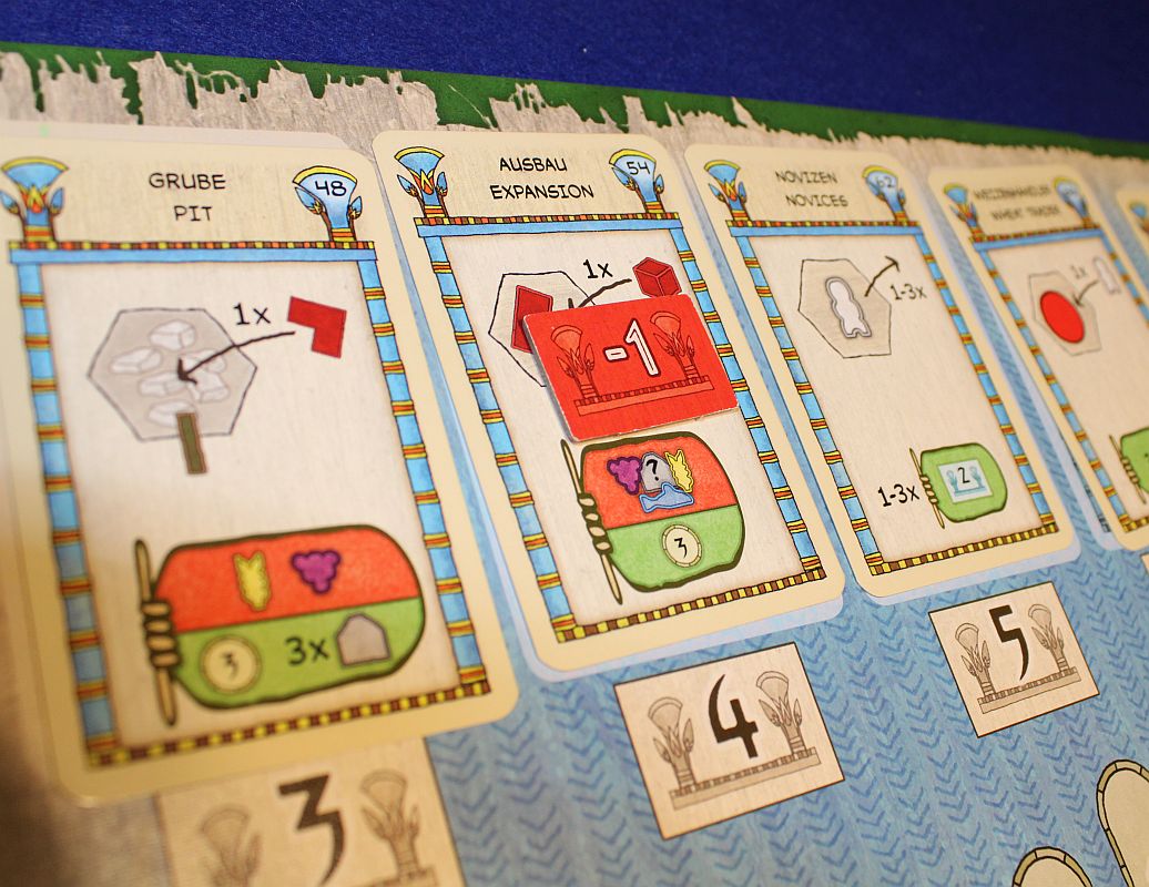 Das gefällt mir gut: FAIYUM verlangt ein gewisses Umdenken beim Deckbau. Ähnlich wie auch bei AEONS END muss man sich Gedanken machen, in welcher Reihenfolge man die Karten ausspielt und somit ablegt. Karten mit starken Aktionen spielt man natürlich gerne frühzeitig – aber dann liegen diese ziemlich weit unten in der Ablage, womit es teuer werden kann, diese wieder auf die Hand zu nehmen. Wartet man aber zu lange mit der Aktion, kann man sie vielleicht gar nicht mehr nutzen, da das Feld mittlerweile belegt ist oder keine Arbeiter mehr zur Verfügung stehen. Somit ist es ein ständiges Abwägen, was man nun am besten in welcher Reihenfolge macht. Außerdem muss man sich mit der Zeit entscheiden, welche Karten man nur deswegen spielt, damit sie von der Hand sind und nicht mehr aufgenommen werden. Dieses daraus entstehende spezielle Spielgefühl finde ich sehr reizvoll.