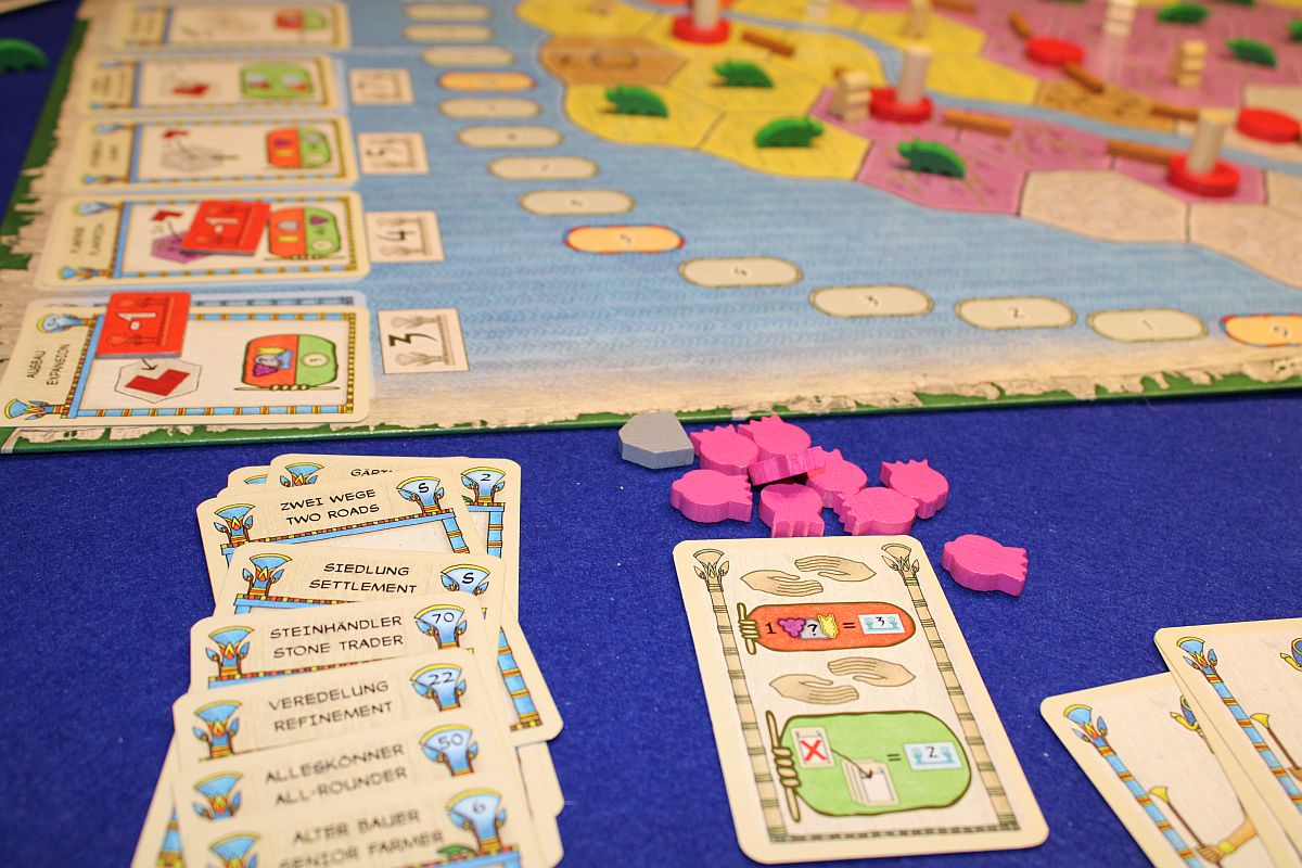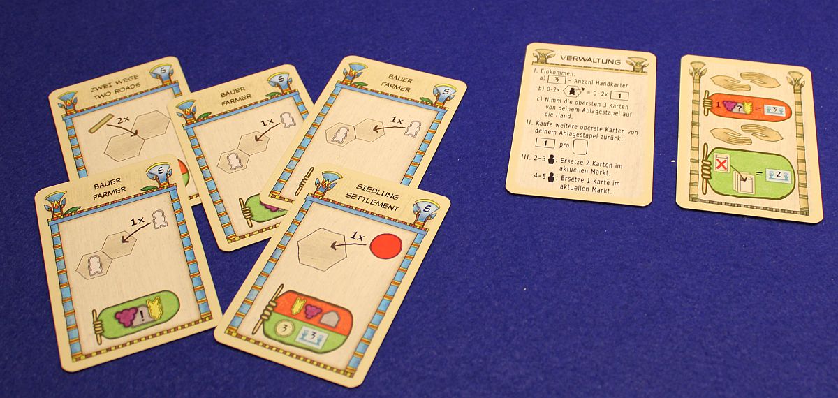 Ablauf... im Kern ist FAIYUM ein Deckbau-Spiel. Ist man an der Reihe, spielt man eine Karte offen aus und führt die damit verbundene Aktion aus. Bspw. spielt man einen Bauern, in dem man eine Arbeiterfigur auf ein Getreidefeld stellt und dafür Weizen als Rohstoff einnimmt. Als Alternativen dazu kauft man sich entweder eine neue Karte vom Markt direkt auf die Hand oder sorgt dafür, dass die ausgespielten Karten wieder auf die Hand zurück kommen. Genau bei diesem Punkt setzt aber eine Besonderheit ein. Denn man bekommt kostenlos lediglich die letzten drei ausgespielten Karten wieder zurück, jede weitere muss man bei Einhaltung der Reihenfolge zusätzlich bezahlen. Mit dieser nicht grundlos als Verwaltung bezeichneten Aktion erhält man auch Einkommen und es werden Karten aus dem Markt entfernt. Zusätzlich hat man die Möglichkeit, auf dem Spielplan eingesetzte Arbeiter wieder in den allgemeinen Vorrat zu befördern.