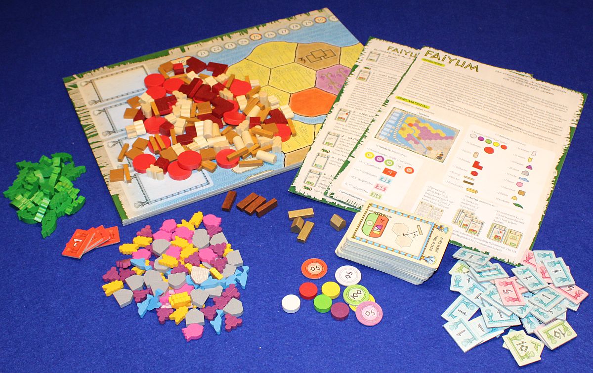 Thema... vor langer langer Zeit wurde das Faiyyum-Becken in Ägypten urbanisiert – und wir dürfen diese Entwicklung nachspielen. Also werden Krokodile vertrieben, Ackerland hergestellt und Straßen und Siedlungen errichtet. Ganz klassische Spielmanns-Kost also – zumindest wenn man das grundsätzliche Thema betrachtet. Allerdings gibt es schon feine Nuancen, die zu beachten sind. Wir bauen nämlich im Auftrag des Pharao an einer gemeinsamen Infrastruktur und somit stehen von mir errichtete Städte und Wege auch allen anderen zur weiteren Verfügung.