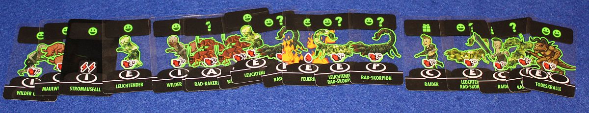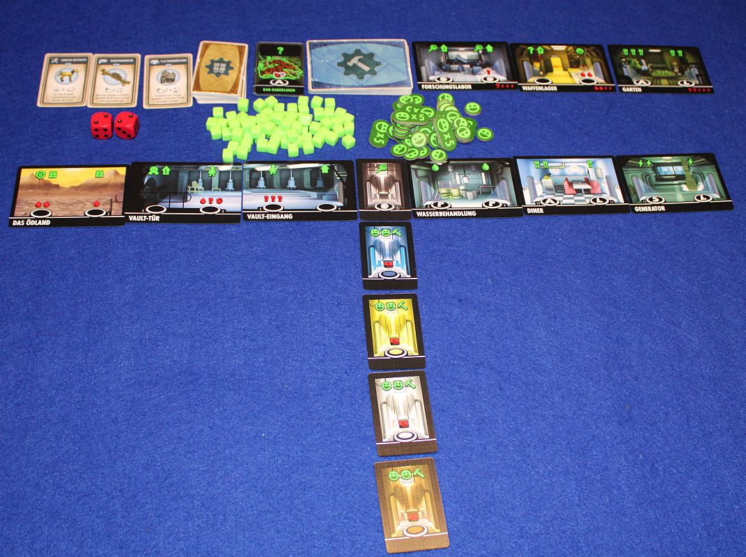 Abwechslung und Spannung bringen somit meist nur die Würfel ins Spiel. Wer dabei völlig vom Würfelglück verlassen ist, der wird diesen Glückseinfluss verfluchen. Aber im Verhältnis zum gewollten Anspruch und der Spielzeit ist dieses Glückselement in meinen Augen völlig angemessen. Zumal auch beim Nachziehen von neuen Raum- und Gegenstandskarten ein nicht unerheblicher Glückseinfluss besteht. Da wartet man die ganze Zeit auf einen bestimmten Gegenstand und erbarmt sich dann, einen anderen aus der Auslage zu nehmen. Natürlich wird dann der Wunschgegenstand nachgezogen – und ebenso natürlich wird mir dieser dann vor der Nase weggeschnappt. Aber das Leben ist kein Ponyhof – erst recht nicht in einer post-apokalyptischen Welt.