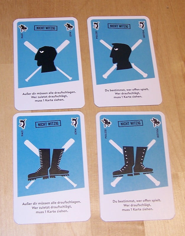 Wie auch die Bücher, lässt einem das Kartenspiel die politische Gesinnung des Autors durchaus spüren. So sollen Nazis gehauen werden (der langsamste Spieler bekommt zur Strafe eine Karte). Allerdings sehen die Polizei-Karten den Nazi-Karten sehr sehr ähnlich (ein Schelm, wer Böses dabei denkt). Und wer auf eine Polizei-Karte haut, der bekommt ebenfalls eine Strafkarte.