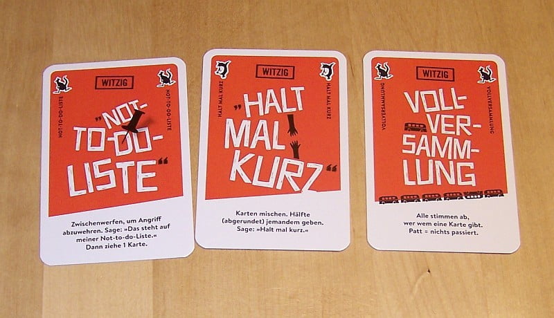 Allerdings gibt es auf jeder Karte eine Sonderfunktion, die immer sofort ausgeführt werden muss. Über diese Funktionen wird man meist effektiver die Karten los. Und da HALT MAL KURZ eben kein Glücksspiel ist, ist bspw. Schnick-Schnack-Schnuck eine solche Funktion, um Karten loszuwerden.