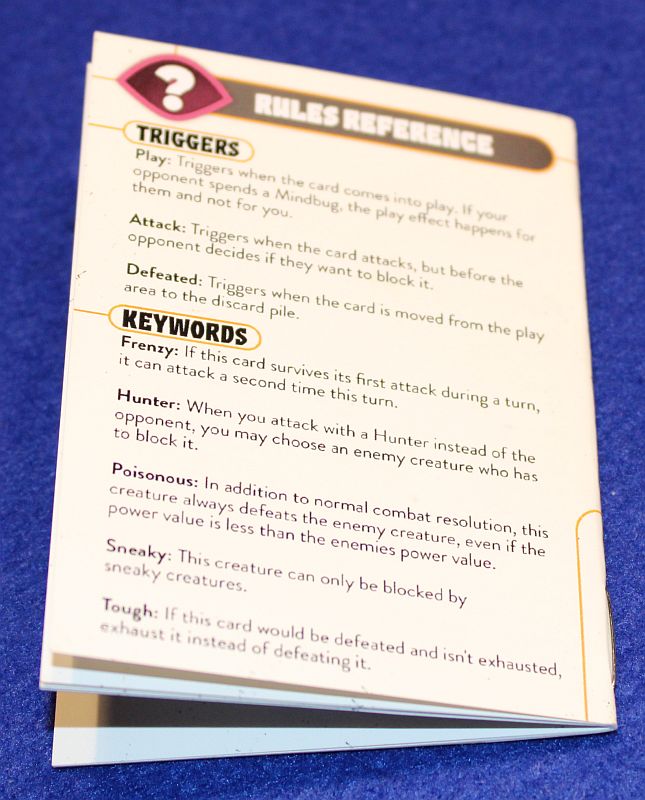 Das gefällt mir nicht so gut: Da ich bisher eher nicht so gerne MAGIC: THE GATHERING und Konsorten gespielt habe, fremdel ich immer noch ein wenig mit den Schlüsselbegriffen auf den einzelnen Karten. Mir wollen die einfach nicht ins Hirn! So schaue ich also ständig nach, was nun frezy oder tough bedeutet. Das liegt sicherlich auch an meiner fehlenden Fremdsprachenkompetenz, weil solche Begriffe bei mir einfach nicht in Blut übergehen wollen. Die Anleitung hat diese Begriffe glücklicherweise schon auf der letzten Seite übersichtlich dargestellt. Noch schöner hätte ich es aber gefunden, wenn diese Infos für jede Partei als eigene Übersichtskarte zur Verfügung stünden. Vielleicht wäre das eine Option für die Rückseite der Mindbug-Karten...