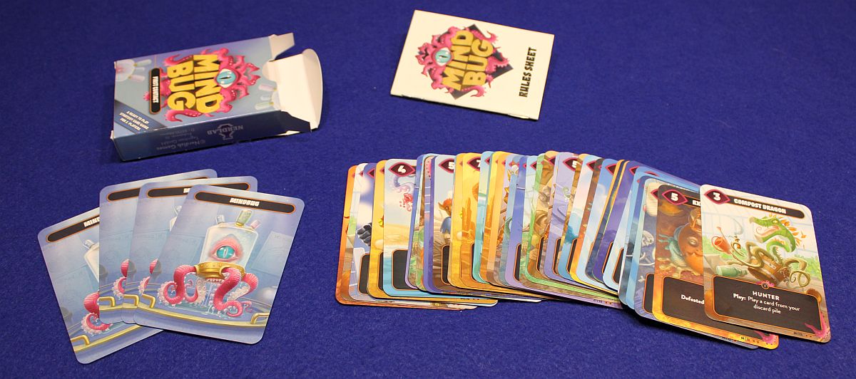 Ausstattung… in der handlichen Box befinden sich "nur" 52 Karten und ein kleines Regelheft. Das kann sich vielleicht in der anstehenden Crowdfunding-Kampagne noch ändern. Aber wirklich mehr braucht es gar nicht. Vier dieser 52 Karten stechen übrigens ein wenig heraus, da diese die Namen gebenden Mindbugs darstellen.