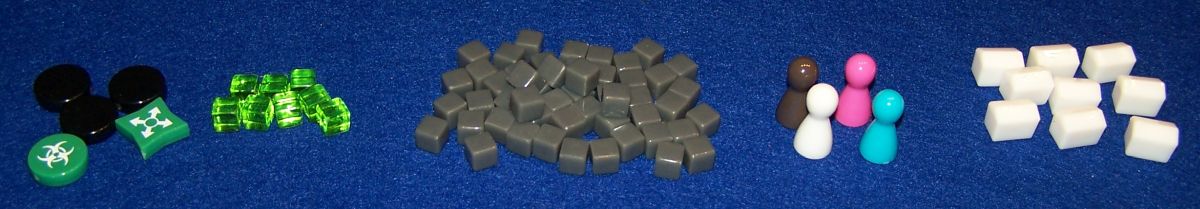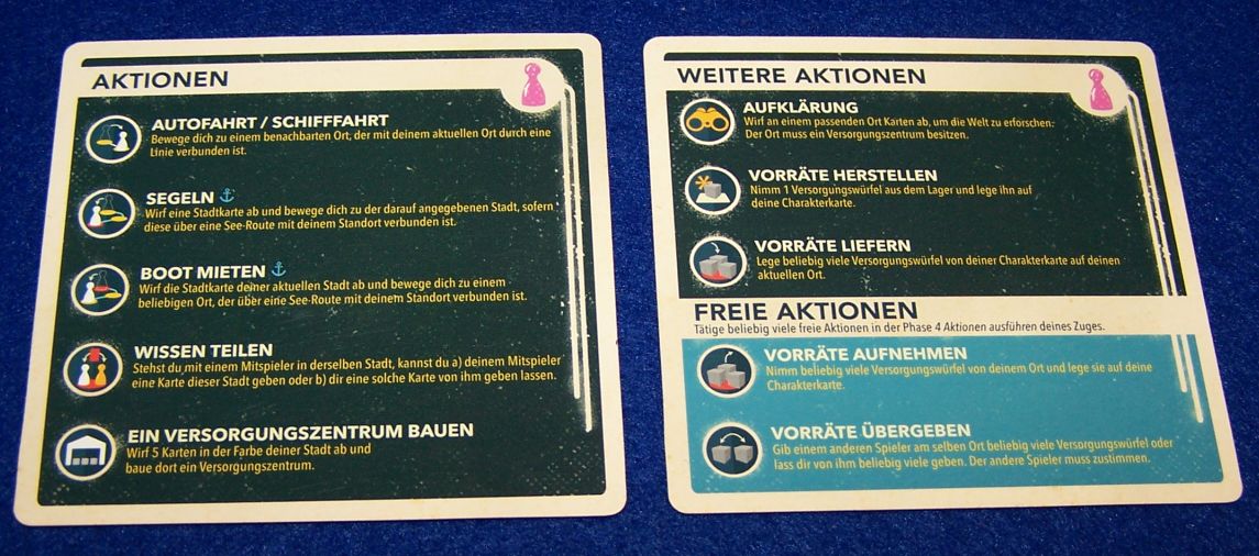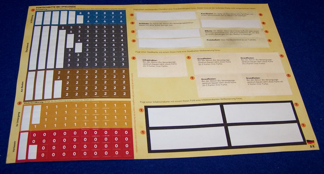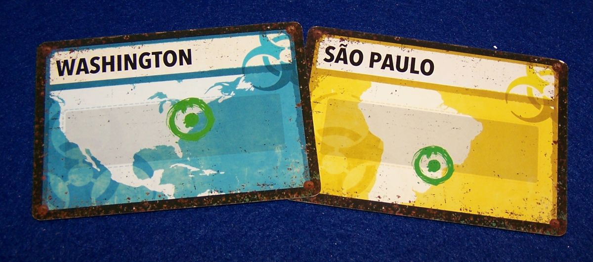 Ablauf... statt kleine Würfel vom Spielplan zu nehmen, müssen nun Würfel auf Städte gelegt werden. Zusätzlich ist die Infrastruktur zu verbessern. Spielmechanisch wird das bekanntermaßen über verschieden farbige Stadtkarten gehandhabt, die man sammelt und als Set abgibt. Weiterhin bleibt das Problem daran, dass man Handkarten nicht einfach mal so mit den Mitspielern tauschen kann, sondern die einzelnen Figuren müssen sich in den Städten treffen. In der Zwischenzeit breitet sich die Seuche aus, was über zurückzunehmende Vorratswürfel dargestellt wird. Liegt in einer infizierten Stadt kein solcher Würfel parat, legt man dort einen grünen Seuchenwürfel ab – und das maximal nur achtmal, weil dann eine Monatspartie zwangsläufig beendet ist.