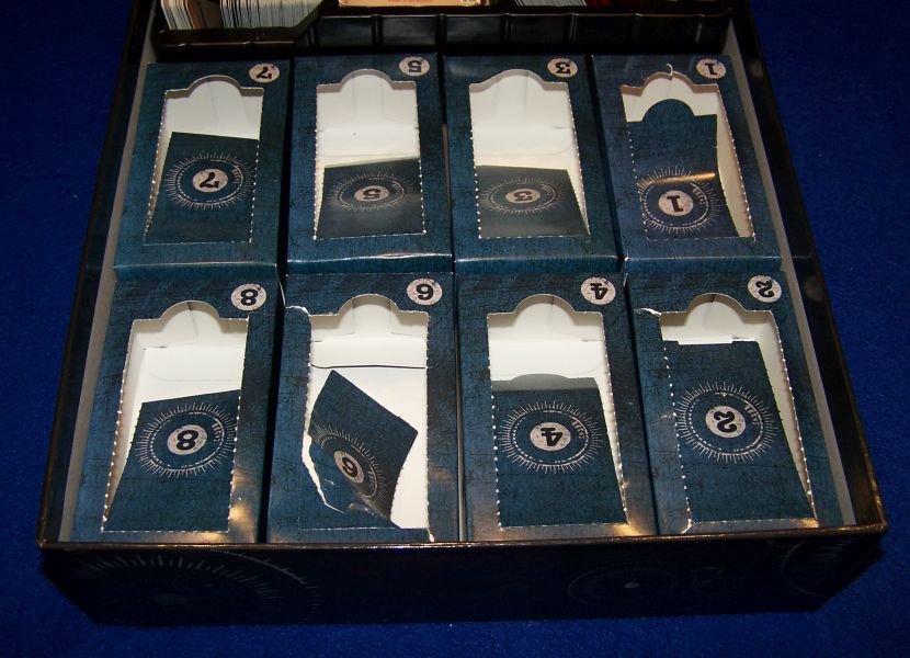 Kein Problem habe ich übrigens damit, dass nun das Spiel als solches nicht mehr benutzt werden kann. Ich kann sehr gut nachvollziehen, wenn jemand damit ein Problem hat ("Sooo viel Geld aber auch Rohstoffe verbraucht, um es dann nach 12+x Partien in die Mülltonne werfen zu können?") – ich selbst kann das allerdings akzeptieren. Ich will hier jetzt auch gar keine Ökobilanz führen oder mich damit rechtfertigen, dass ich Spielmaterial wiederverwende und der Rest in die Altpapiertonne kommt (oder gar zu einer Collage verarbeitet wird). Es ist definitiv ein Punkt, den man kritisch betrachten muss. Ich für meinen persönlichen Teil finde das aber nicht dermaßen problematisch, dass ich deswegen einen Bogen um Legacy- oder auch EXIT-Spiele machen würde.