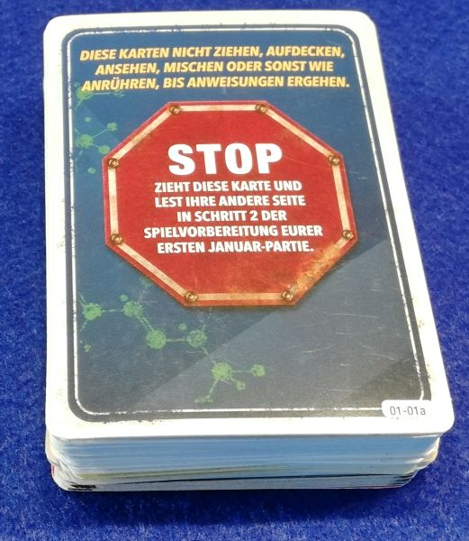 Denn PANDEMIC LEGACY SEASON 2 ist als Kampagne in 12 Monate unterteilt, wobei man maximal nur zwei Partien pro Monat spielt. In jedem Monat werden neue Legacy-Karten aufgedeckt. Die bringen einerseits neue Aufgaben, aber eben auch zusätzliche Aktionen ins Spiel. Außerdem wird mit diesen Karten die Hintergrundgeschichte weiter erzählt. Schafft man es, gestellte Aufgaben zu erfüllen, wird man mit einem Bonus belohnt. Verliert man dahingegen eine Partie, dann kann man die nächste zumindest mit etwas mehr hilfreichen Subventionen beginnen (die gemeinerweise wieder gekürzt werden, wenn man erfolgreich spielt). Wir haben von den theoretisch möglichen 24 Partien 15 gespielt und waren somit erstaunlich erfolgreich. Vorher haben wir aber auch noch die empfohlene Prolog-Partie durchgeführt. Mit dieser werden die Änderungen zum ursprünglichen PANDEMIE erlebbar, was eine gute Übung für die folgenden Partien ist.