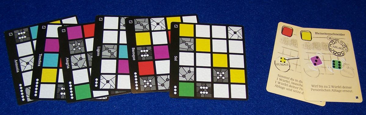 Ausstattung… ist erfreulicherweise so kompakt, dass das Material problemlos in die Box des Grundspiels passt. Auffälligste Neuheiten sind dabei sicherlich die Fensterrosetten und die Würfelkiste. Aber natürlich sind für die zusätzlichen Spieler auch eigene Ablagen, Glassteine und weitere Würfel vorhanden. Abgerundet wird das Paket durch zwei neue Werkzeugkarten sowie neue Geheimaufträge und Baupläne.