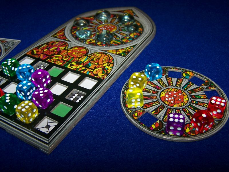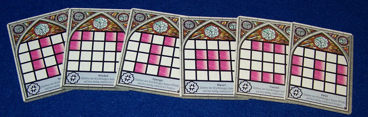 Noch besser gefällt mir aber der optionale Einsatz der Fensterrosette. Denn diese gibt den Spielern Würfel vor, mit denen man im weiteren Verlauf fest rechnen kann. So kennt man nun schon zu Anfang der Partie die Hälfte aller einzubauenden Würfel und kann dementsprechend viel besser planen. Trotzdem bleibt der Glücksfaktor durch die zufällige Auswahl in jeder Runde erhalten. Dadurch, dass man nur noch einen Würfel zur Auswahl hat, wird sogar das Spiel im Idealfall schneller. Allerdings darf man nicht den Fehler machen und denken, dass nun alles einfacher wird. Denn immer noch muss manch ungewollter Würfel aus der Mitte irgendwie in das eigene Muster integriert werden.