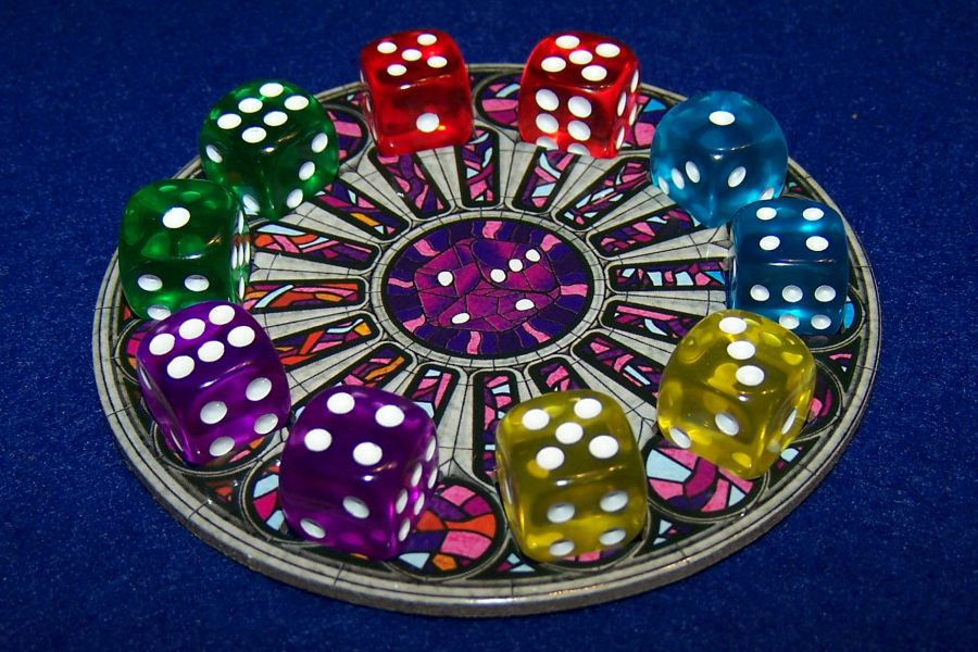 Ablauf… folgt den bekannten Regeln des Grundspiels. Diese ändern sich erst dann ein wenig, wenn man mit den Fensterrosetten spielen will. Macht man das, dann erhalten die Mitspieler schon zu Spielbeginn zehn Würfel – je zwei in den fünf vorhandenen Farben. Diese würfelt man anschließend und verteilt die Würfel auf die Rosette. Statt im Spiel pro Runde zwei Würfel aus der Auswahl zu nehmen, begnügt man sich nun mit nur einem Würfel. Allerdings darf man nun einen zweiten Würfel von der eigenen Rosette nehmen.