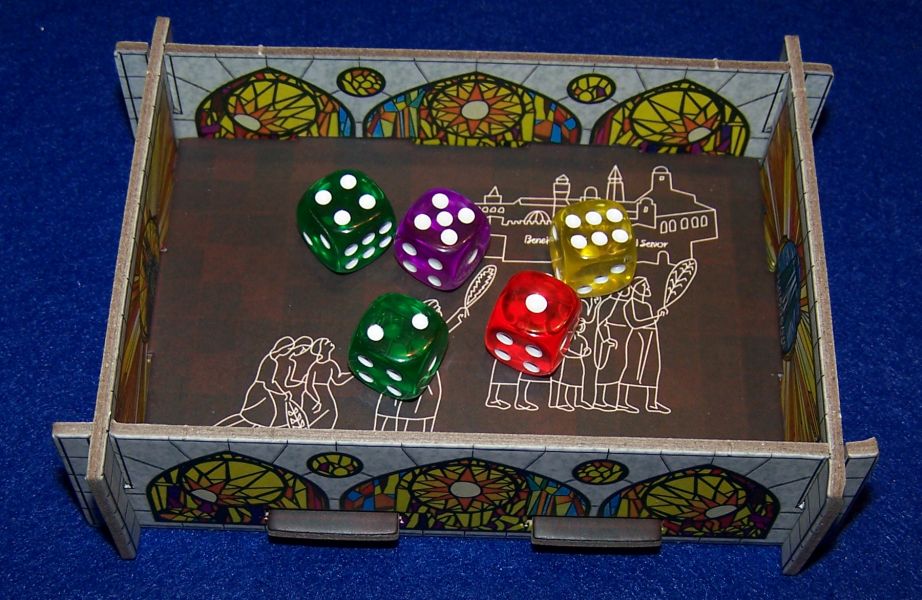 Auch die Auffangschale für die Würfel finde ich praktisch. Natürlich ist sie im eigentlichen Sinn unnötig und kann schlimmstenfalls sogar die Sicht auf die Würfel behindern. Auf der anderen Seite kann man somit aber wunderbar die einzelnen Würfel weitergeben und jeder weiß, wer gerade an der Reihe ist.