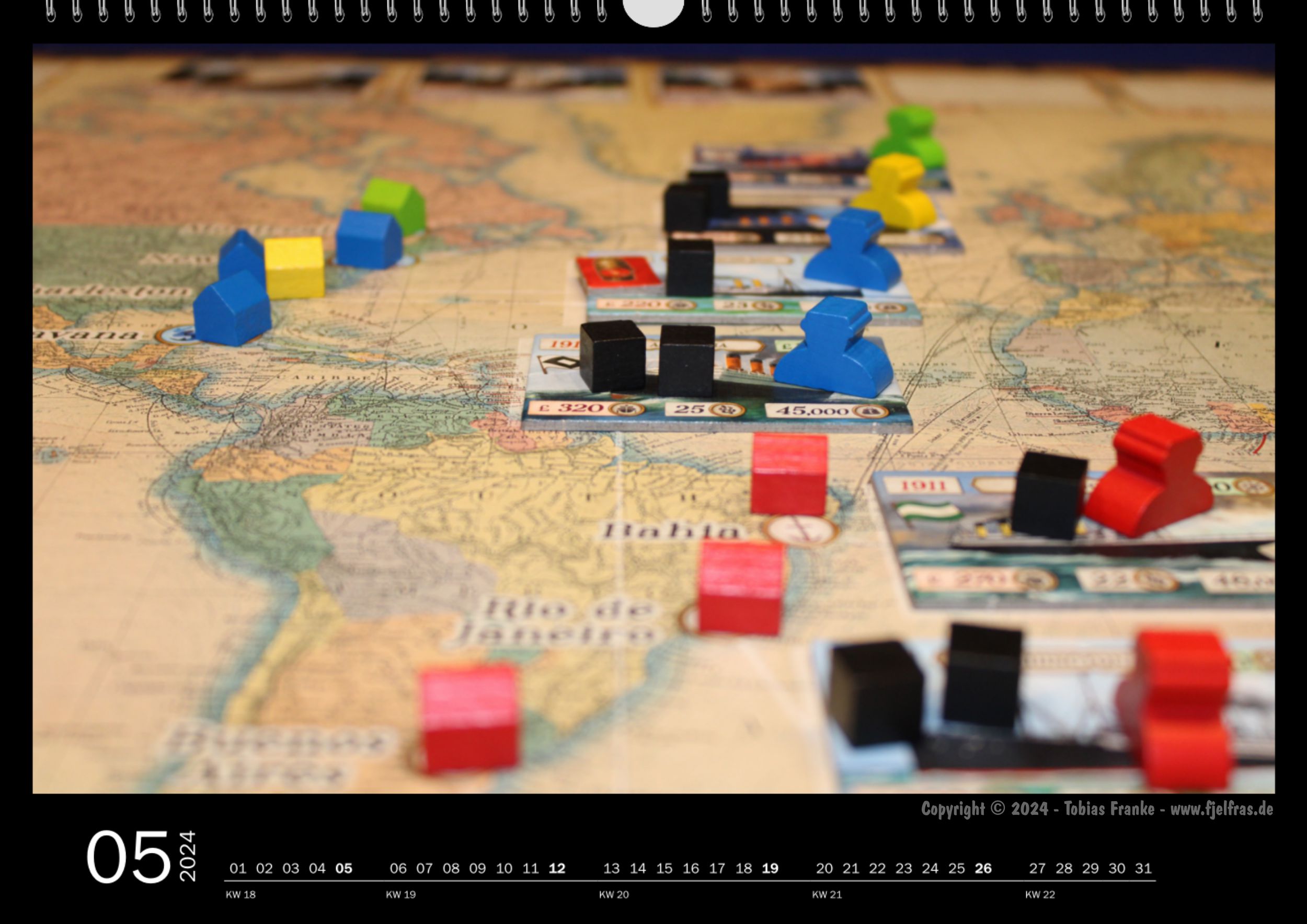 Wenn ich mir schon die Arbeit mache, jedes Jahr einen eige­nen klei­nen Brett­spiel­ka­len­der zu gestal­ten, dann kann ich die­se Arbeit auch tei­len. Des­we­gen nun der Mai 2024 mei­nes pri­va­ten Brettspielkalenders: