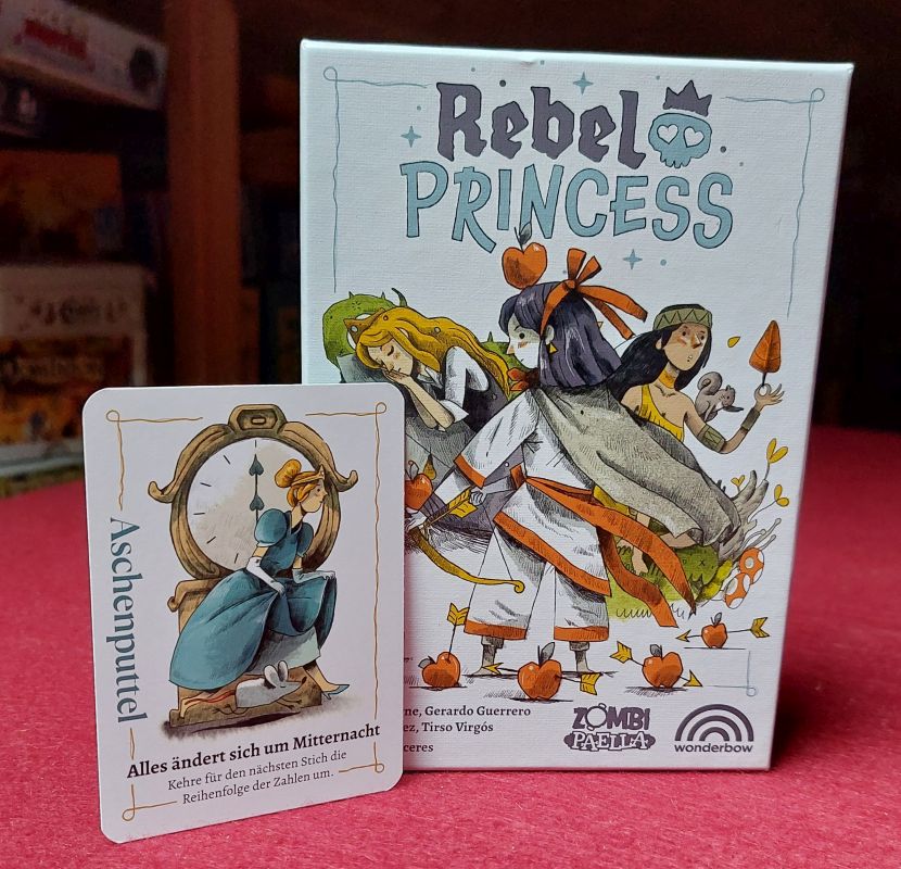 Das erin­nert an bekann­te Kar­ten­spie­le und ist gut ver­gleich­bar mit bspw. ST. PATRICK aus neue­rer Zeit. Aller­dings hat REBEL PRINCESS noch zwei beson­de­re Knif­fe zu bie­ten. In jeder der fünf Spiel­run­den tre­ten näm­lich Son­der­re­geln in Kraft, die das Gesche­hen ziem­lich auf­mi­schen kön­nen. Zusätz­lich besit­zen wir alle eine beson­de­re Prin­zes­sin­nen-Eigen­schaft, die wir ein­mal pro Run­de nut­zen kön­nen. Dadurch ist das Spiel sehr dyna­misch. Jede Run­de muss neu gedacht wer­den und es ist sehr reiz­voll, die Beson­der­hei­ten der Prin­zes­sin­nen gewinn­brin­gend zu nut­zen. Für stich­spiel­af­fi­ne Per­so­nen ist REBEL PRINCESS somit defi­ni­tiv einen genaue­ren Blick wert – zumal das The­ma bezaubert.