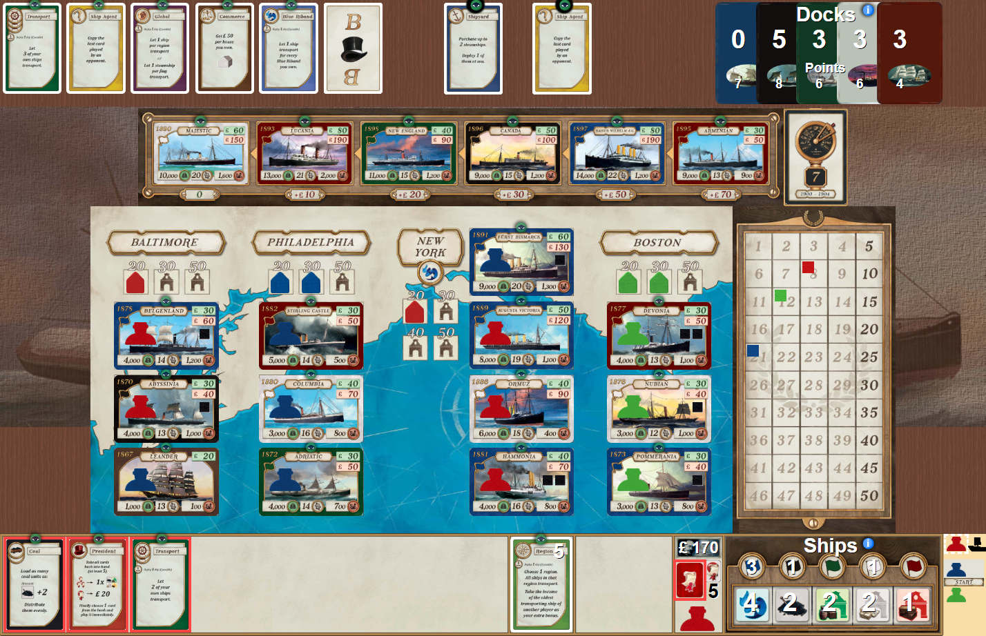 Ich bin mir ja nicht so sicher, ob die Macher von Yucata es wirklich notwendig gehabt haben, Ostergeschenke zu verteilen. Aktuell wird dort immer noch mit den hohen Serverauslastungen gekämpft – da wäre ein weiteres tolles Kennerspiel gar nicht notwendig gewesen, um noch mehr Leute auf die Seite zu holen. Aber natürlich will ich nicht meckern, sondern erfreue mich vielmehr, dass man dort nun TRANSATLANTIC spielen kann.