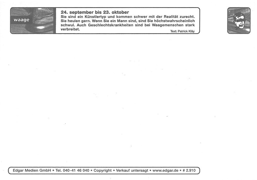Eine dieser Perlen sind die Sternzeichen-Charakter-Karten von Edgar. Fern ab von Wartezimmer-Klatschzeitungs-Horoskopen werden hier mal ganz wahr die Charaktereigenschaften der einzelnen Sternzeichen unter die Lupe genommen.